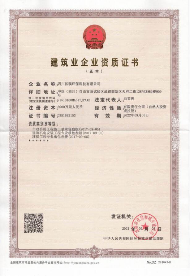 四川省環(huán)境污染防治工程等級確認證書