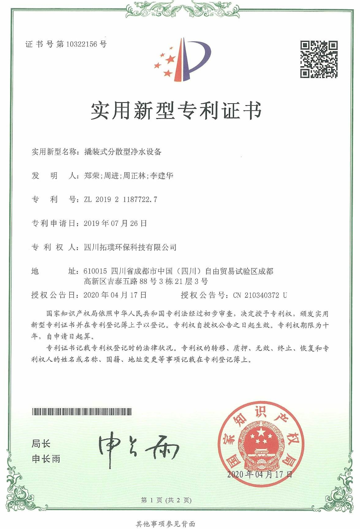 實用新型專利證書